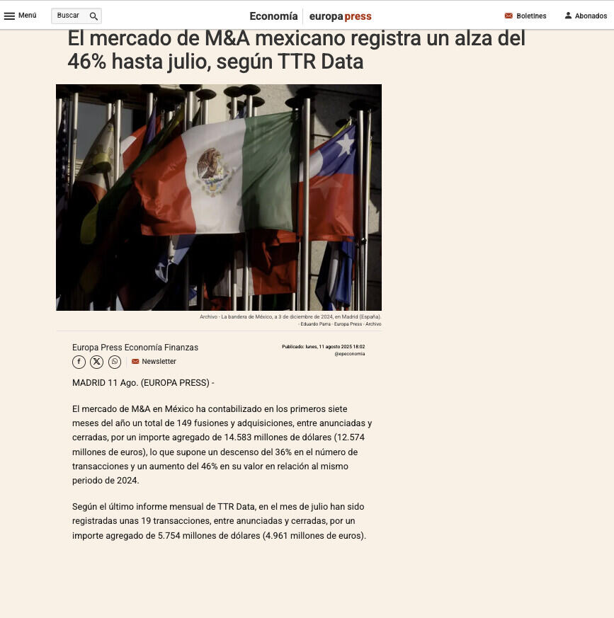 El mercado de M&A mexicano registra un alza del 46% hasta julio, según TTR Data
