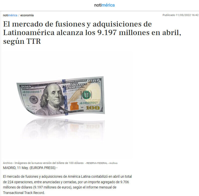 El mercado de fusiones y adquisiciones de Latinoamérica alcanza los 9.197 millones en abril, según TTR