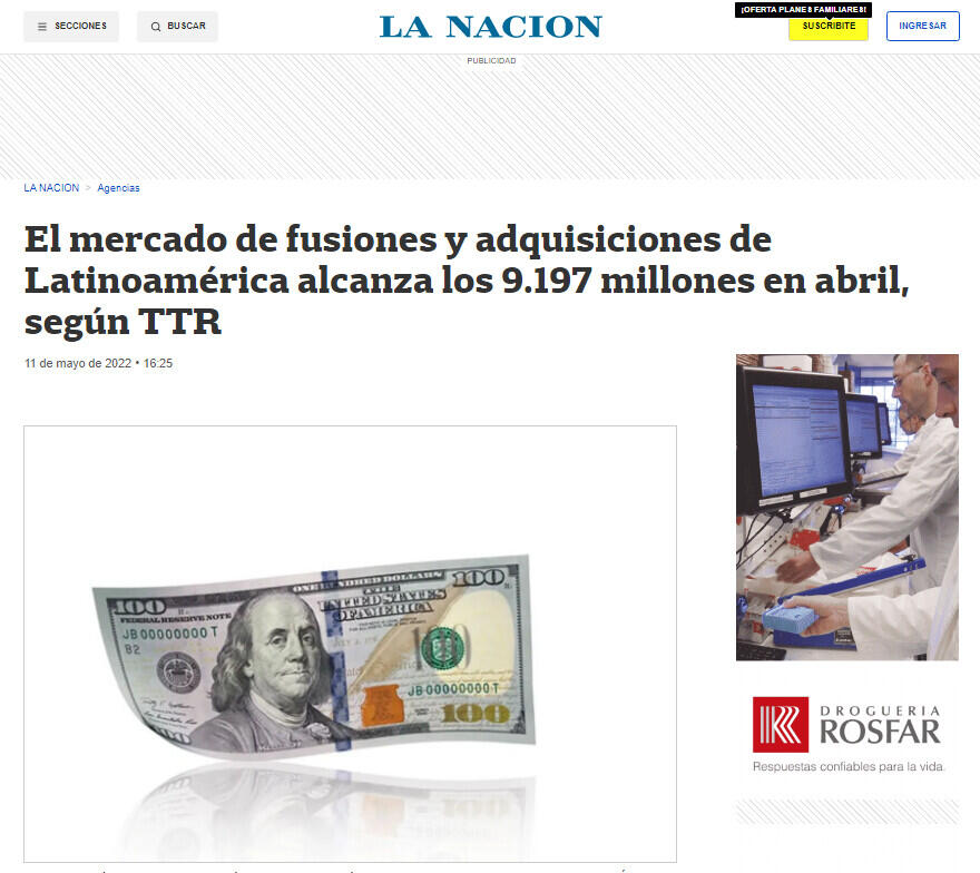 El mercado de fusiones y adquisiciones de Latinoamérica alcanza los 9.197 millones en abril, según TTR