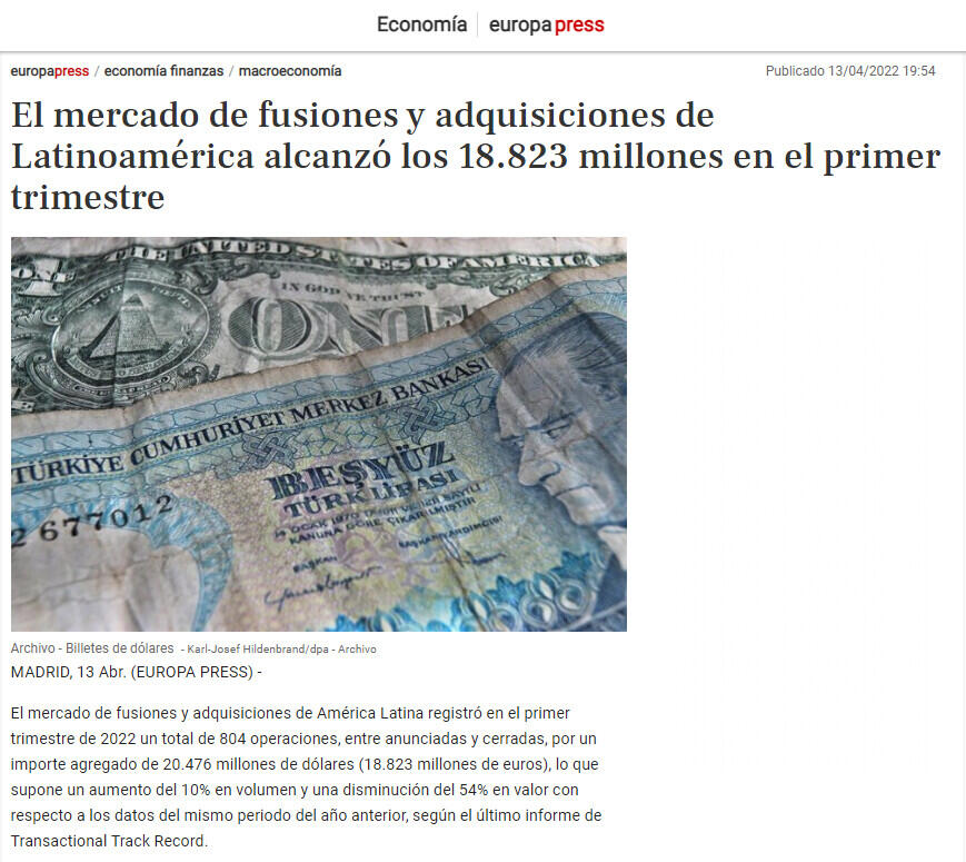 El mercado de fusiones y adquisiciones de América Latina registró en el primer trimestre de 2022 un total de 804 operaciones, entre anunciadas y cerradas, por un importe agregado de 20.476 millones de dólares (18.823 millones de euros), lo que supone un aumento del 10% en volumen y una disminución del 54% en valor con respecto a los datos del mismo periodo del año anterior, según el último informe de Transactional Track Record.