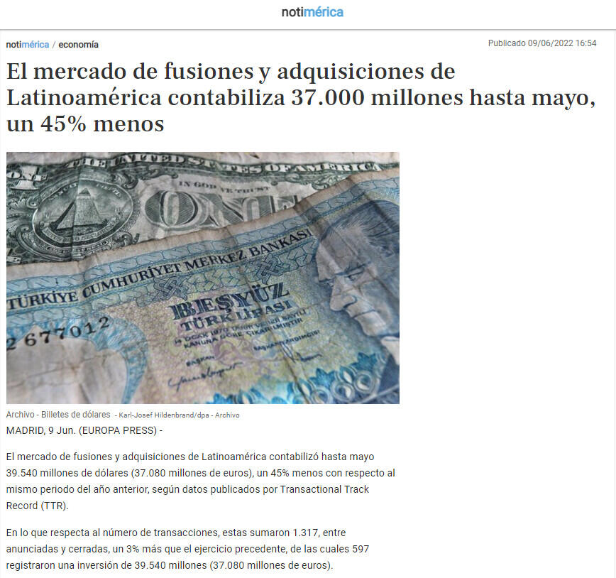 El mercado de fusiones y adquisiciones de Latinoamérica contabilizó hasta mayo 39.540 millones de dólares (37.080 millones de euros), un 45% menos con respecto al mismo periodo del año anterior, según datos publicados por Transactional Track Record (TTR).