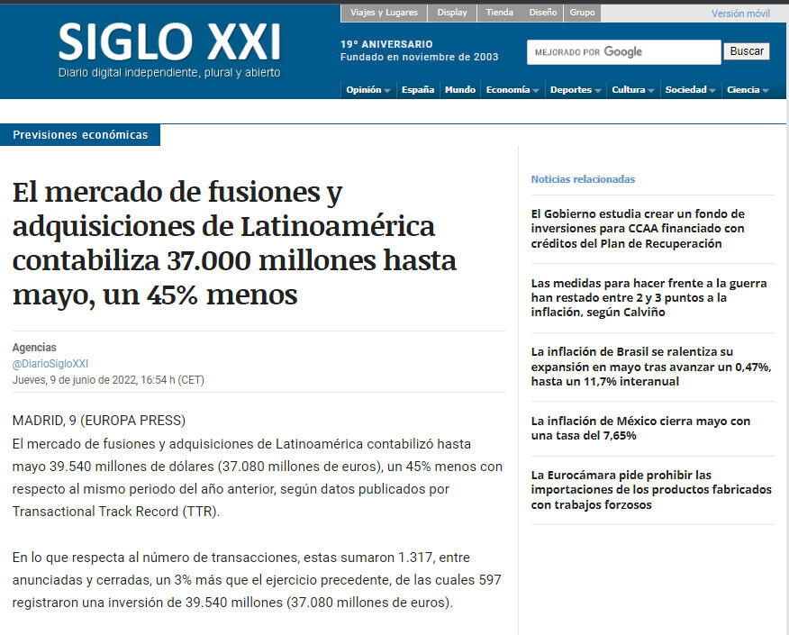 Según datos de mayo, por número de operaciones, Brasil lideró el ranking de países más activos de la región con 930 operaciones (+9%), y un descenso del 42% en el capital movilizado, con 25.968 millones (24.357 millones de euros). A Brasil le siguió México, con 148 operaciones (+1%), y un descenso del 35% en el importe con respecto a mayo de 2021, hasta 5.904 millones (5.538 millones de euros).