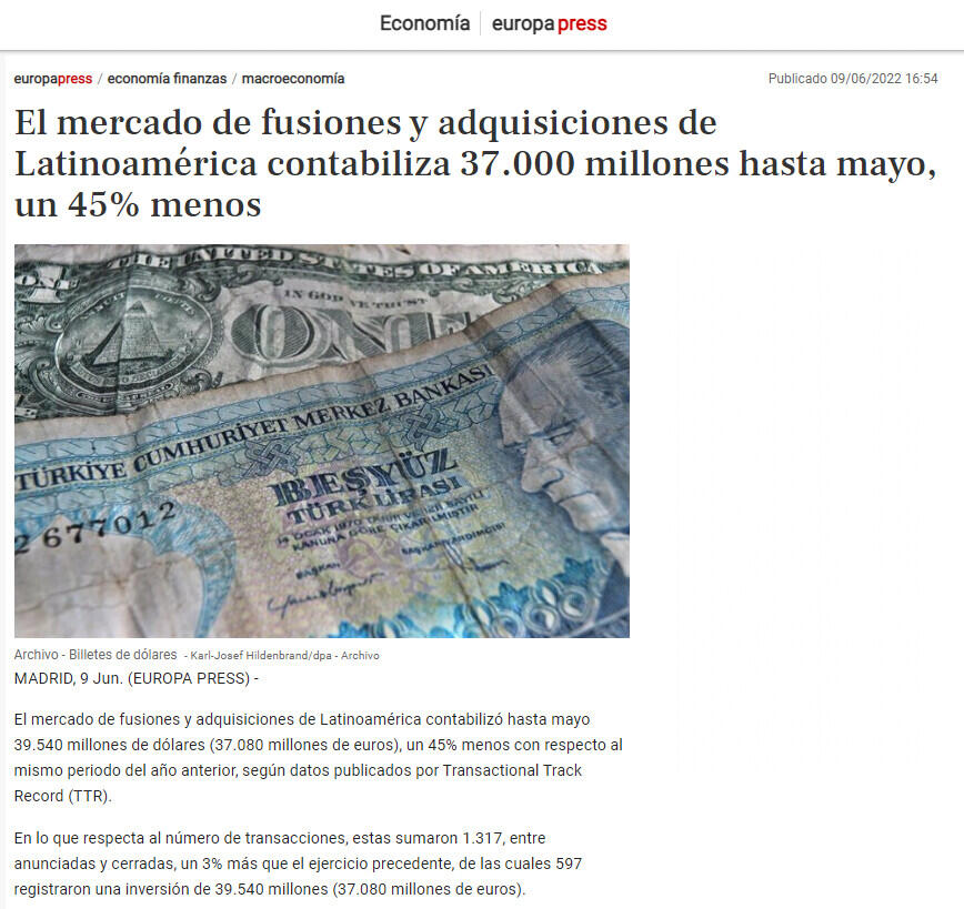 Según datos de mayo, por número de operaciones, Brasil lideró el ranking de países más activos de la región con 930 operaciones (+9%), y un descenso del 42% en el capital movilizado, con 25.968 millones (24.357 millones de euros). A Brasil le siguió México, con 148 operaciones (+1%), y un descenso del 35% en el importe con respecto a mayo de 2021, hasta 5.904 millones (5.538 millones de euros).