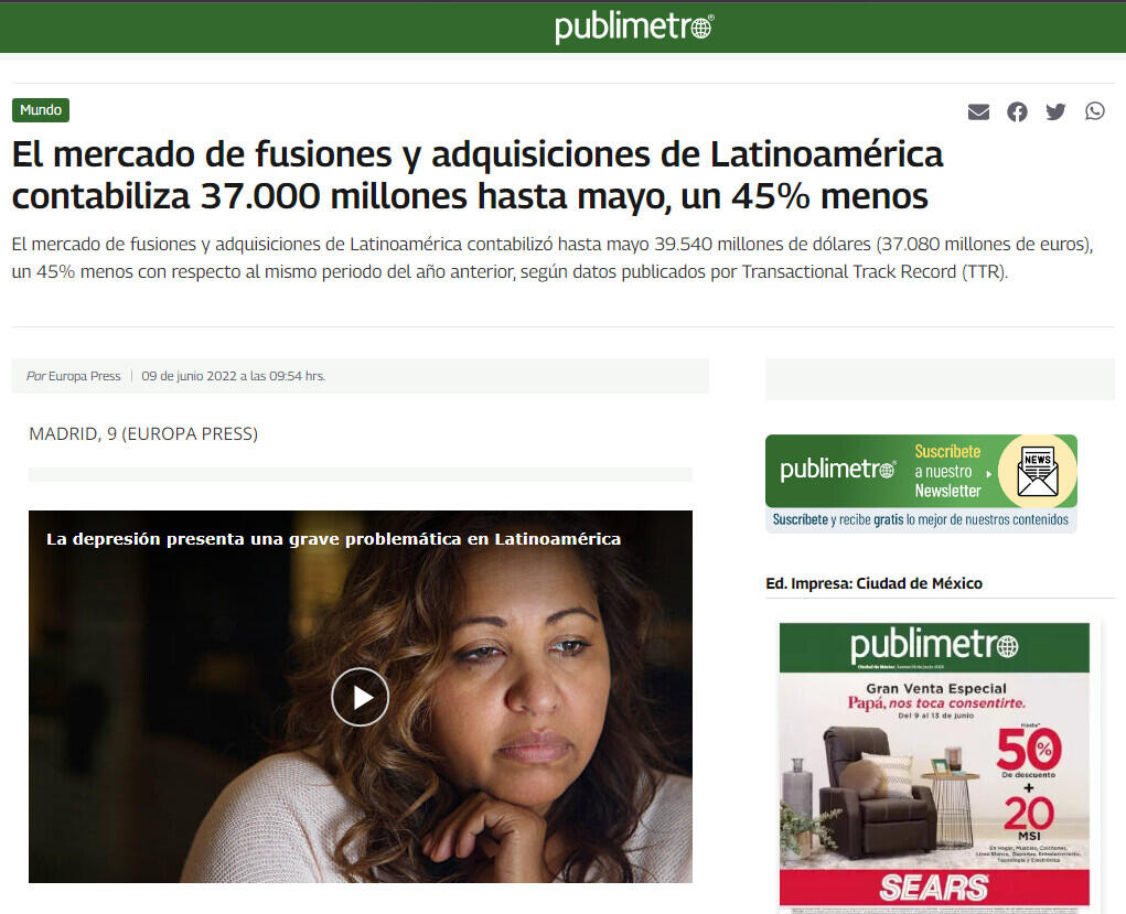 Según datos de mayo, por número de operaciones, Brasil lideró el ranking de países más activos de la región con 930 operaciones (+9%), y un descenso del 42% en el capital movilizado, con 25.968 millones (24.357 millones de euros). A Brasil le siguió México, con 148 operaciones (+1%), y un descenso del 35% en el importe con respecto a mayo de 2021, hasta 5.904 millones (5.538 millones de euros).