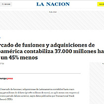 El mercado de fusiones y adquisiciones de Latinoamérica contabilizó hasta mayo 39.540 millones de dólares (37.080 millones de euros), un 45% menos con respecto al mismo periodo del año anterior, según datos publicados por Transactional Track Record (TTR).
