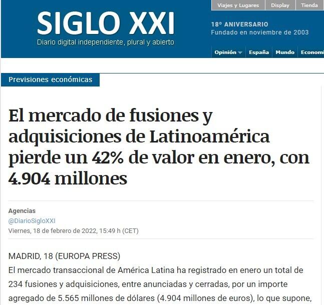 El mercado transaccional de América Latina ha registrado en enero un total de 234 fusiones y adquisiciones, entre anunciadas y cerradas, por un importe agregado de 5.565 millones de dólares (4.904 millones de euros), lo que supone, con respecto a enero de 2021, un aumento del 22% en el número de operaciones, pero un descenso del 42% en el importe de estas, según un informe de Transactional Track Record y Datasite.