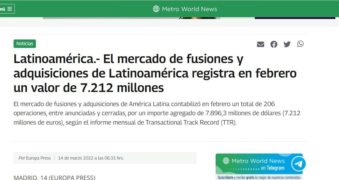 El mercado de fusiones y adquisiciones de América Latina contabilizó en febrero un total de 206 operaciones, entre anunciadas y cerradas, por un importe agregado de 7.896,3 millones de dólares (7.212 millones de euros), según el informe mensual de Transactional Track Record (TTR).