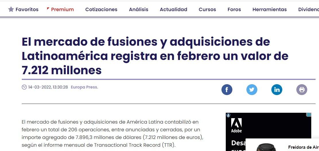 El mercado de fusiones y adquisiciones de Latinoamérica registra en febrero un valor de 7.212 millones