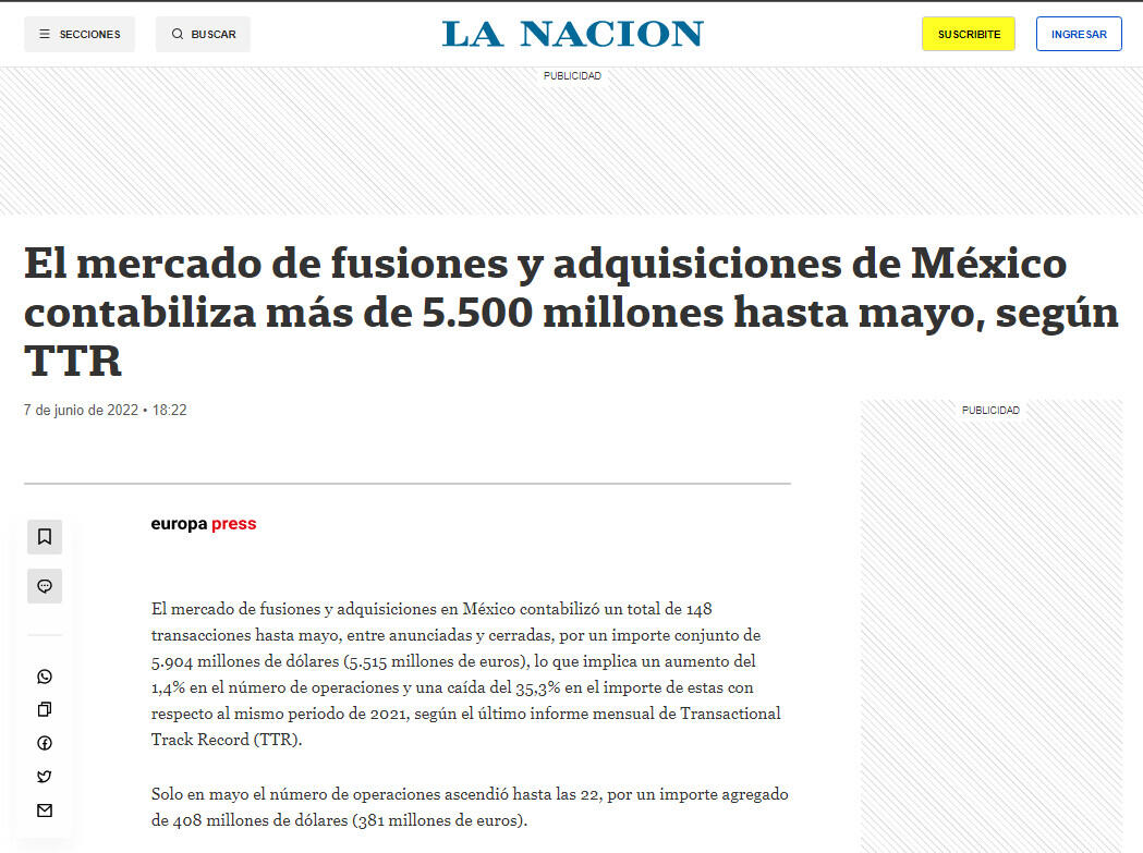 El mercado de fusiones y adquisiciones de México contabiliza más de 5.500 millones hasta mayo, según TTR