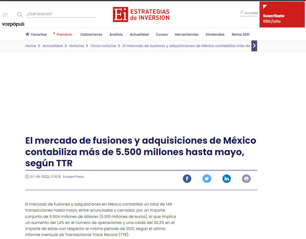 El mercado de fusiones y adquisiciones de México contabiliza más de 5.500 millones hasta mayo, según TTR