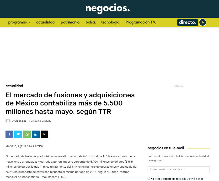 El mercado de fusiones y adquisiciones de México contabiliza más de 5.500 millones hasta mayo, según TTR