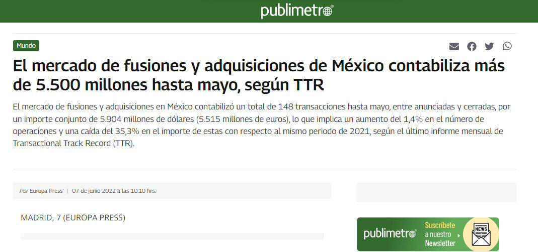 El mercado de fusiones y adquisiciones en México contabilizó un total de 148 transacciones hasta mayo, entre anunciadas y cerradas, por un importe conjunto de 5.904 millones de dólares (5.515 millones de euros), lo que implica un aumento del 1,4% en el número de operaciones y una caída del 35,3% en el importe de estas con respecto al mismo periodo de 2021, según el último informe mensual de Transactional Track Record (TTR).