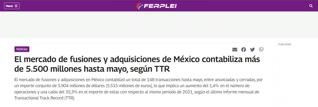 El mercado de fusiones y adquisiciones en México contabilizó un total de 148 transacciones hasta mayo, entre anunciadas y cerradas, por un importe conjunto de 5.904 millones de dólares (5.515 millones de euros), lo que implica un aumento del 1,4% en el número de operaciones y una caída del 35,3% en el importe de estas con respecto al mismo periodo de 2021, según el último informe mensual de Transactional Track Record (TTR).
