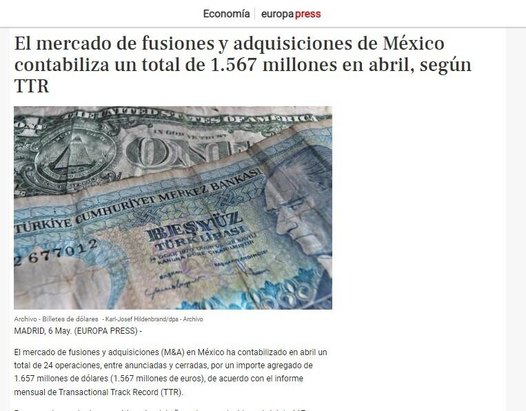 El mercado de fusiones y adquisiciones de México contabiliza un total de 1.567 millones en abril, según TTR