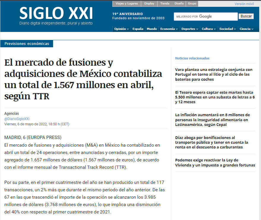 El mercado de fusiones y adquisiciones de México contabiliza un total de 1.567 millones en abril, según TTR