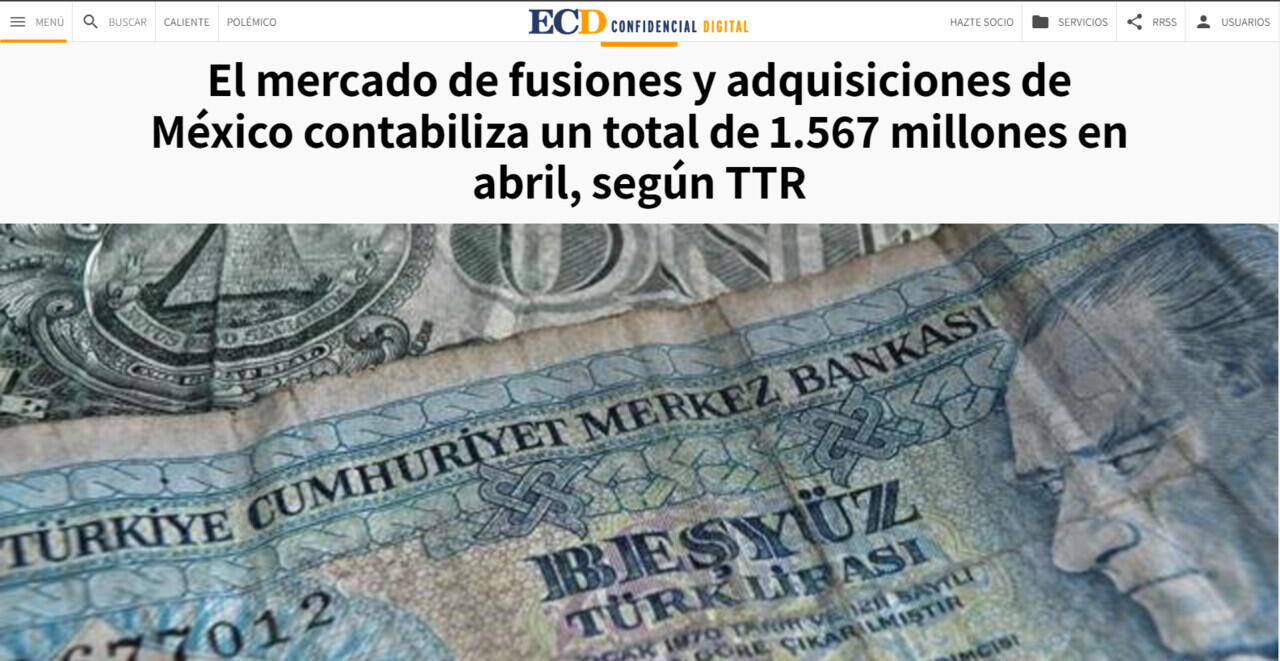 El mercado de fusiones y adquisiciones de México contabiliza un total de 1.567 millones en abril, según TTR