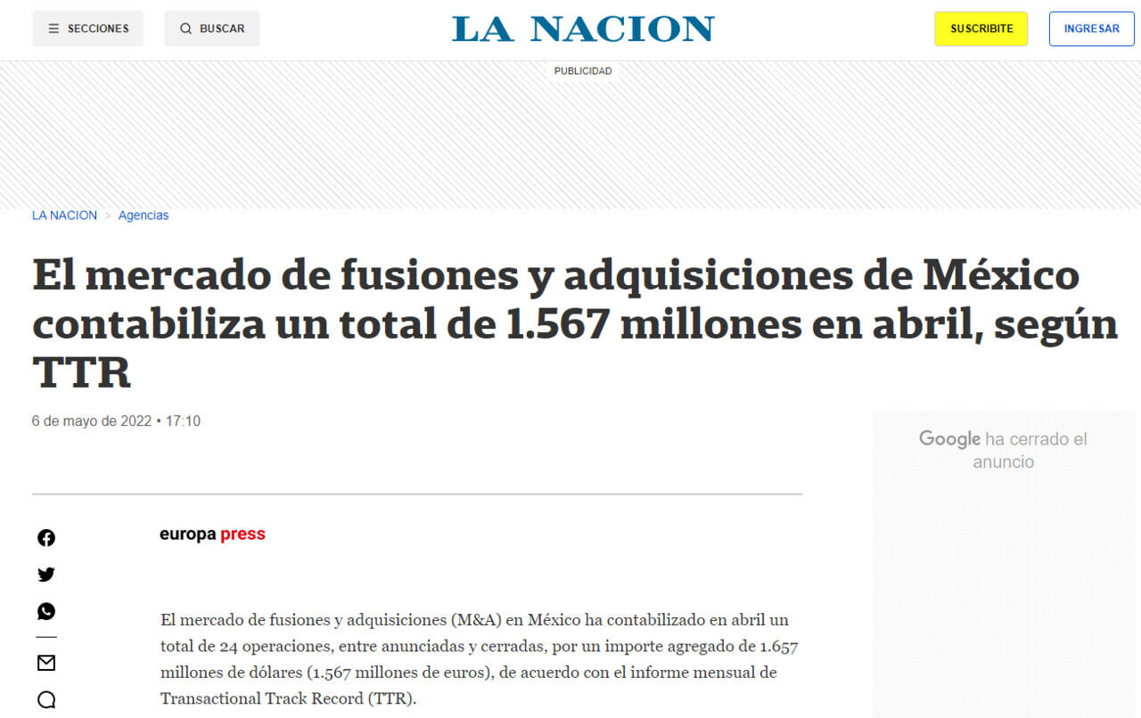 El mercado de fusiones y adquisiciones de México contabiliza un total de 1.567 millones en abril, según TTR