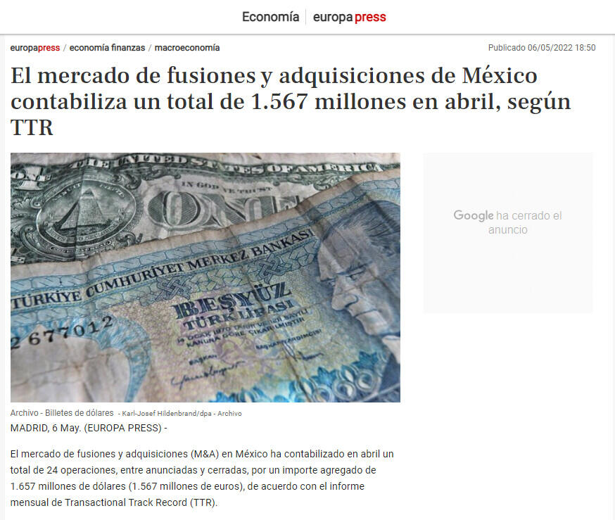 El mercado de fusiones y adquisiciones de México contabiliza un total de 1.567 millones en abril, según TTR