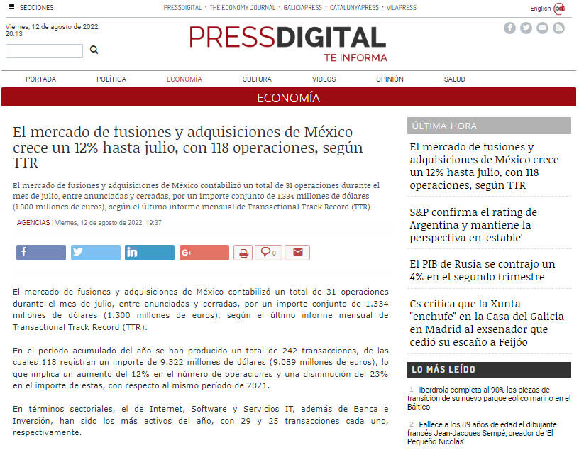 El mercado de fusiones y adquisiciones de México crece un 12% hasta julio, con 118 operaciones, según TTR