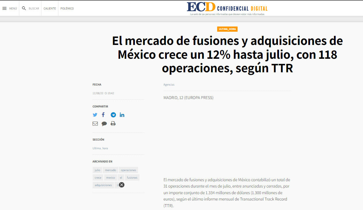 El mercado de fusiones y adquisiciones de México contabilizó un total de 31 operaciones durante el mes de julio, entre anunciadas y cerradas, por un importe conjunto de 1.334 millones de dólares (1.300 millones de euros), según el último informe mensual de Transactional Track Record (TTR).