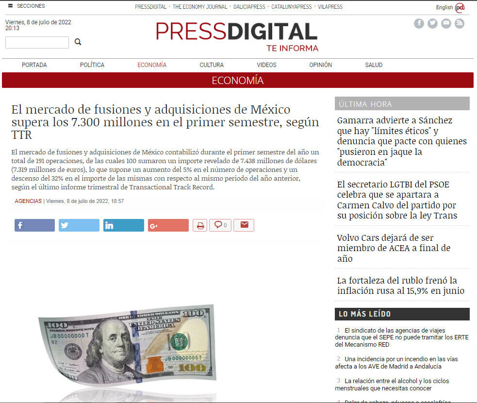 El mercado de fusiones y adquisiciones de México supera los 7.300 millones en el primer semestre, según TTR
