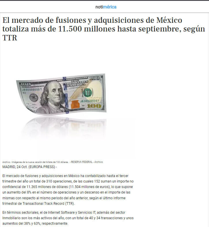 El mercado de fusiones y adquisiciones en México ha contabilizado hasta el tercer trimestre del año un total de 310 operaciones, de las cuales 152 suman un importe no confidencial de 11.365 millones de dólares (11.504 millones de euros), lo que supone un aumento del 8% en el número de operaciones y un descenso en el importe de las mismas con respecto al mismo periodo del año anterior, según el último informe trimestral de Transactional Track Record (TTR).