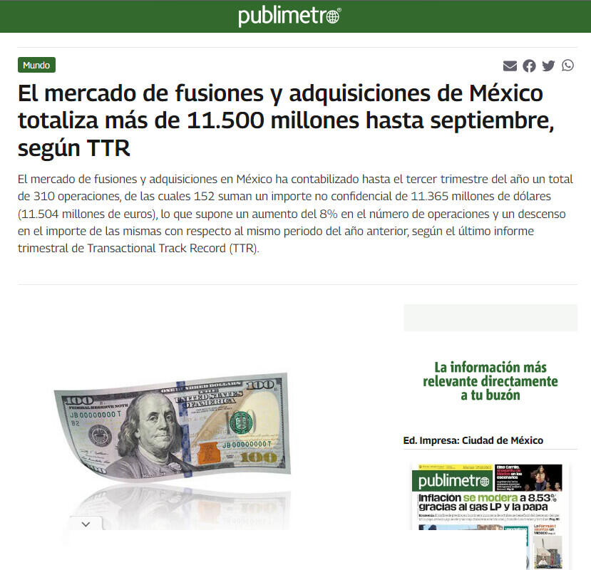 El mercado de fusiones y adquisiciones de México totaliza más de 11.500 millones hasta septiembre, según TTR