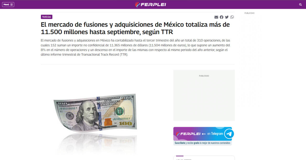 El mercado de fusiones y adquisiciones de México totaliza más de 11.500 millones hasta septiembre, según TTR