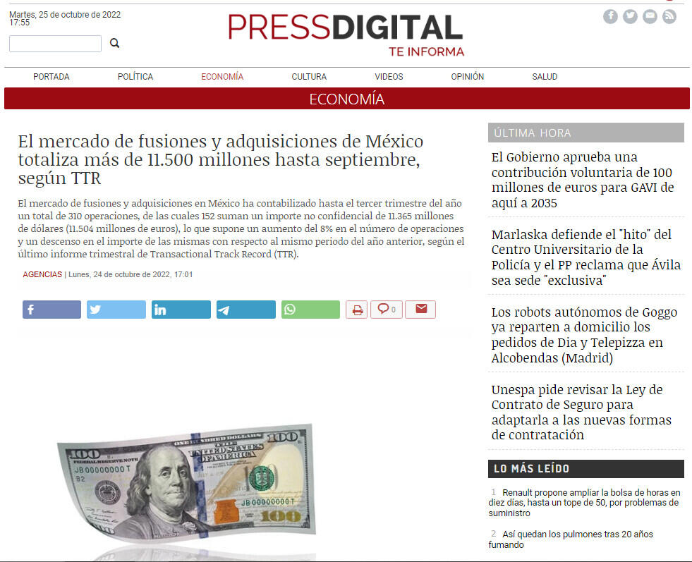 Para el tercer trimestre de 2022, TTR ha seleccionado como operación destacada la relacionada con SWVL, empresa dedicada a operar autobuses en rutas fijas y permite a los clientes reservar y pagar por ellos mediante una app con sede en Dubai, la cual ha adquirido la empresa mexicana Urbvan por 82 millones de dólares (83 millones de euros).