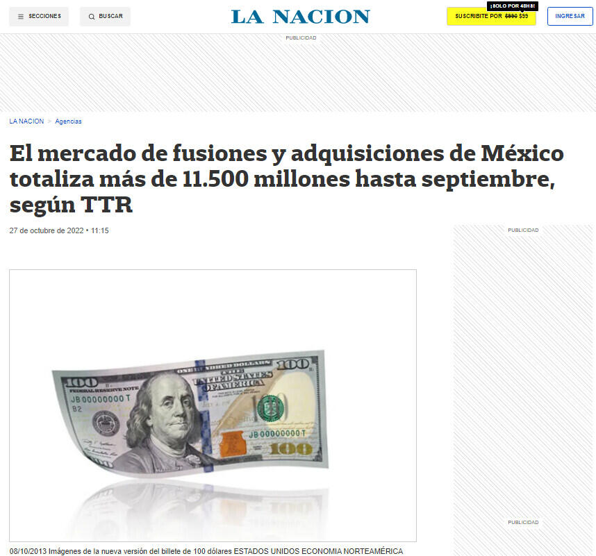 El mercado de fusiones y adquisiciones de México totaliza más de 11.500 millones hasta septiembre, según TTR