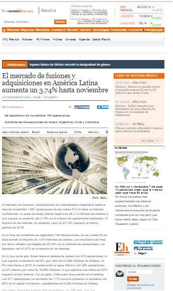 El mercado de fusiones y adquisiciones en Latinoamérica registraron hasta el mes de noviembre 1,887 operaciones de las cuales 810 no tiene un importe confidencial. La suma de estas últimas llega a los 88,312 millones de dólares lo que supone un aumento del 3.74% en el número de operaciones realizadas. El importe de las mismas, no obstante, cayó un 23.19% respecto al mismo periodo de 2016.