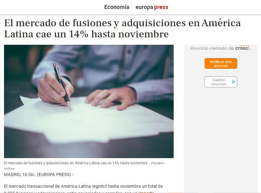 El mercado de fusiones y adquisiciones en América Latina cae un 14% hasta noviembre