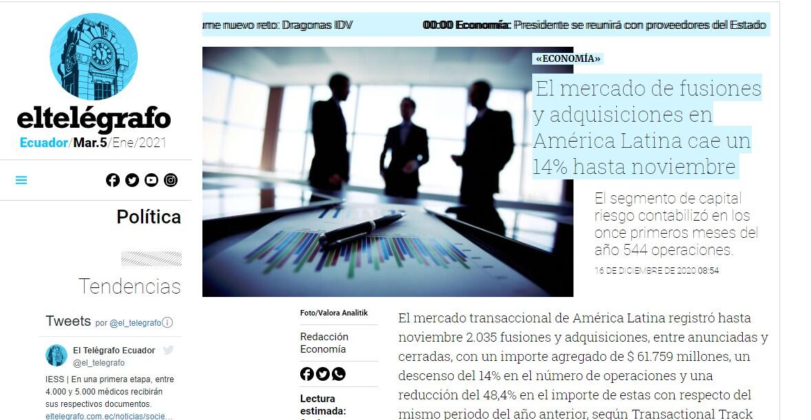 En noviembre, el mercado transaccional de América Latina registró un total de 168 fusiones y adquisiciones, entre anunciadas y cerradas, por un importe agregado de $ 8.041,7 millones.