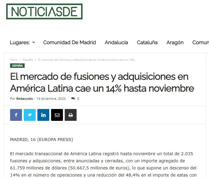 En el mes de noviembre, el mercado transaccional de América Latina registró un total de 168 fusiones y adquisiciones, entre anunciadas y cerradas, por un importe agregado de 8.041,7 millones de dólares (6597,36 millones de euros).