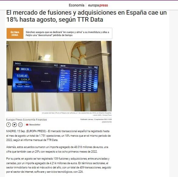 El mercado de fusiones y adquisiciones en España cae un 18% hasta agosto, según TTR Data