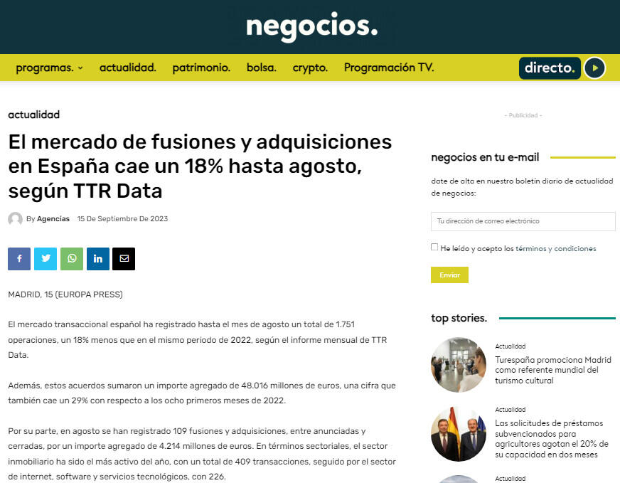 El mercado de fusiones y adquisiciones en España cae un 18% hasta agosto, según TTR Data