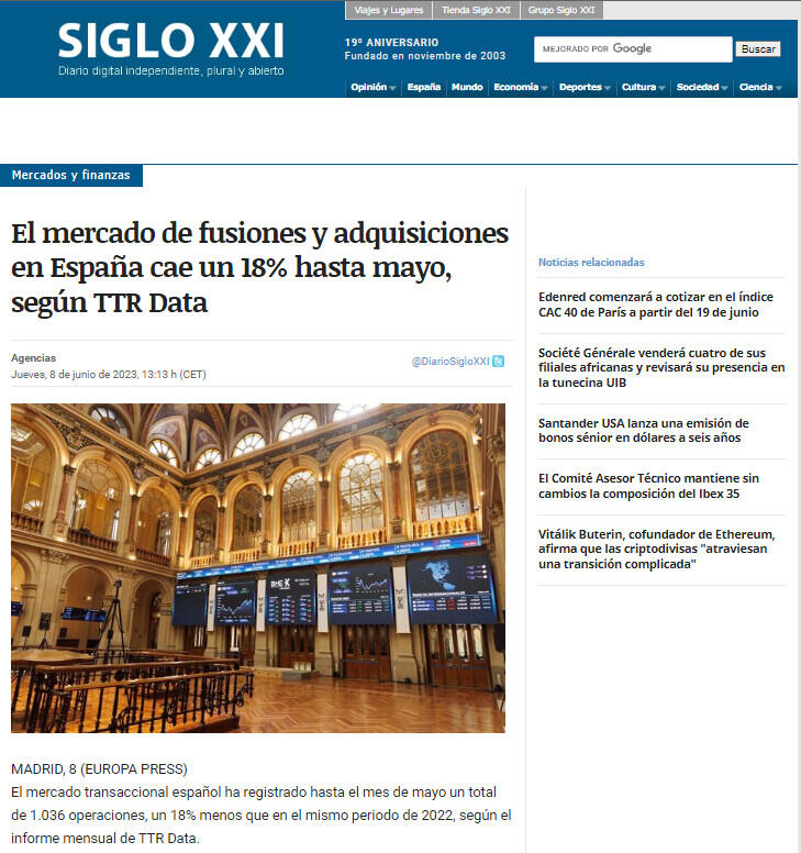 El mercado de fusiones y adquisiciones en España cae un 18% hasta mayo, según TTR Data