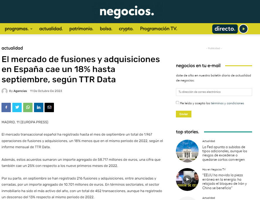 El mercado transaccional español ha registrado hasta el mes de septiembre un total de 1.967 operaciones de fusiones y adquisiciones, un 18% menos que en el mismo periodo de 2022, según el informe mensual de TTR Data.