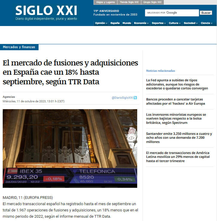 El mercado de fusiones y adquisiciones en España cae un 18% hasta septiembre, según TTR Data