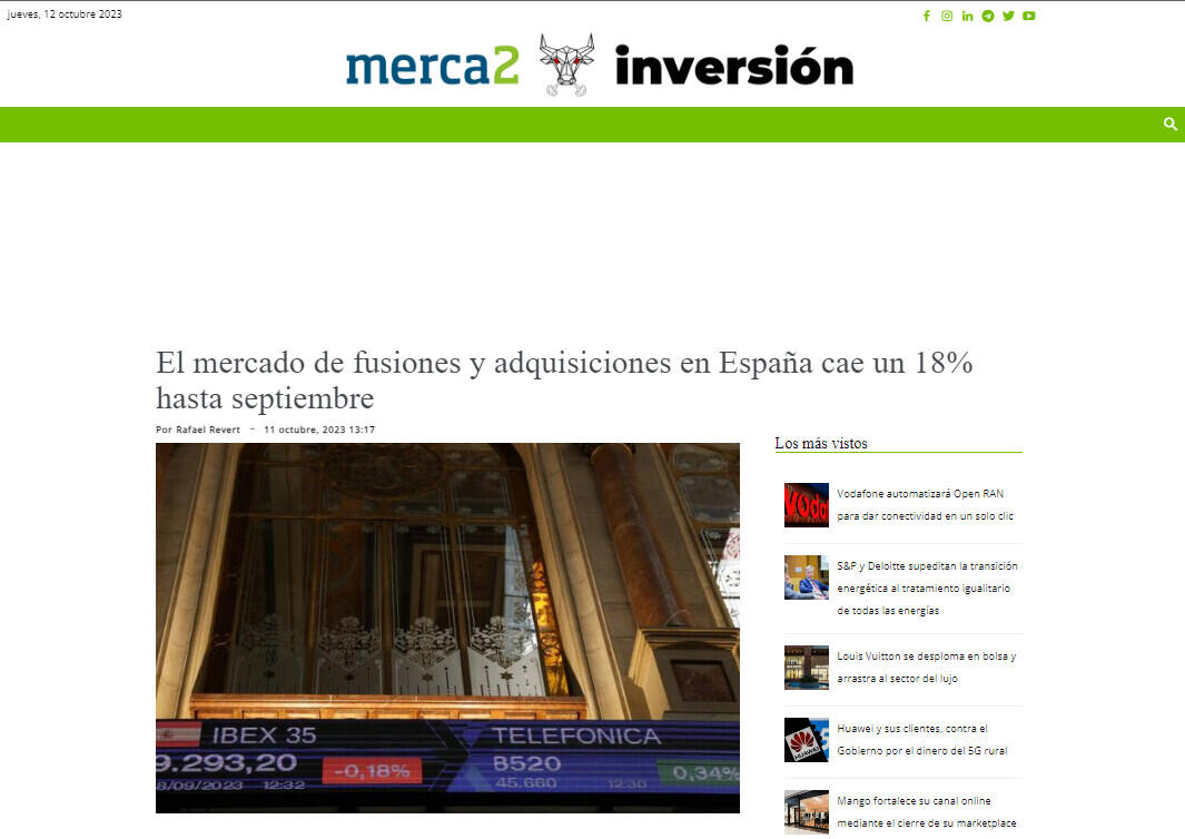 Por su parte, en septiembre se han registrado 216 fusiones y adquisiciones, entre anunciadas y cerradas, por un importe agregado de 10.701 millones de euros. En términos sectoriales, el sector inmobiliario ha sido el más activo del año, con un total de 452 transacciones, aunque ha registrado un descenso del 13% respecto al mismo periodo de 2022.
