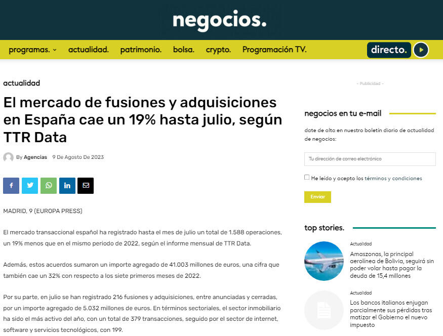El mercado de fusiones y adquisiciones en España cae un 19% hasta julio, según TTR Data