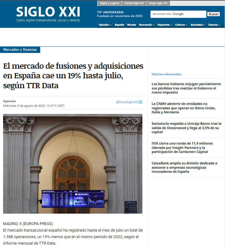 El mercado de fusiones y adquisiciones en España cae un 19% hasta julio, según TTR Data