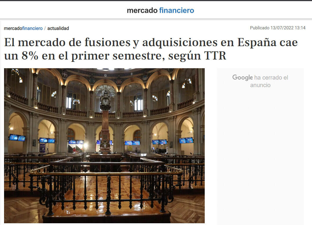 El mercado transaccional español cierra el primer semestre del año con un total de 1.326 fusiones y adquisiciones, entre anunciadas y cerradas, un 8% menos con respecto al mismo periodo de 2021, según el informe trimestral de TTR en colaboración con Intralinks.