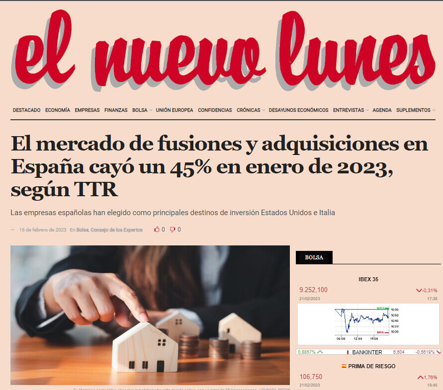 El mercado de fusiones y adquisiciones en España cayó un 45% en enero de 2023, según TTR