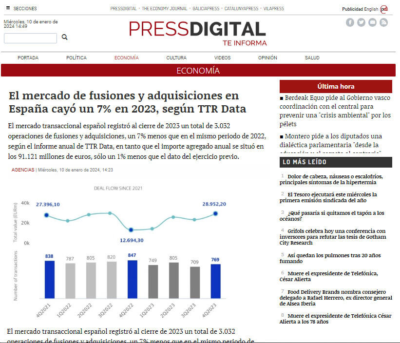 El mercado transaccional español registró al cierre de 2023 un total de 3.032 operaciones de fusiones y adquisiciones, un 7% menos que en el mismo periodo de 2022, según el informe anual de TTR Data, en tanto que el importe agregado anual se situó en los 91.121 millones de euros, sólo un 1% menos que el dato del ejercicio previo.