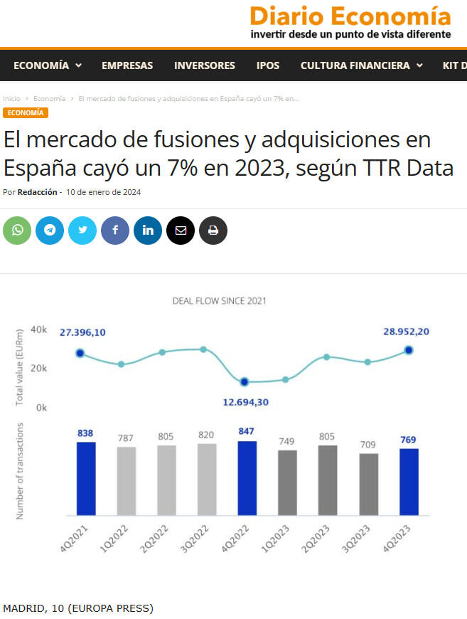 El mercado de fusiones y adquisiciones en España cayó un 7% en 2023, según TTR Data