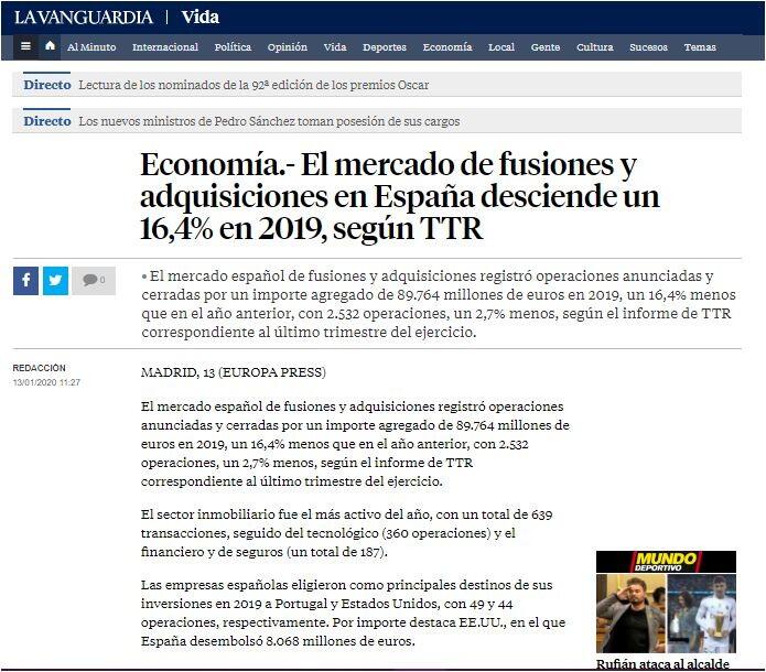 El mercado de fusiones y adquisiciones en España desciende un 16,4% en 2019, según TTR