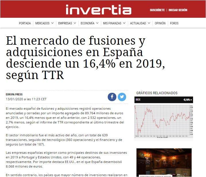 El mercado de fusiones y adquisiciones en España desciende un 16,4% en 2019, según TTR
