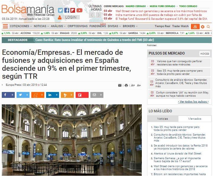 El mercado de fusiones y adquisiciones en España desciende un 9% en el primer trimestre, según TTR