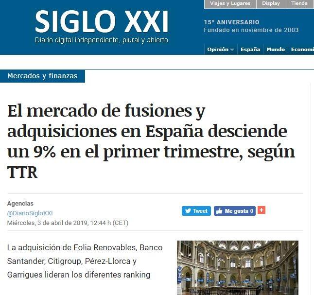 La transacción destacada por TTR en este periodo ha sido la adquisición de Eolia Renovables por parte de AIMCo. La operación, valorada en 1.400 millones, ha estado asesorada por la parte legal por Pérez-Llorca, Linklaters, Cuatrecasas, KPMG Abogados, y PwC Tax & Legal España. Por la parte financiera, la transacción ha sido asesorada por Cantor Fitzgerald, EY España y RBC Capital Markets.